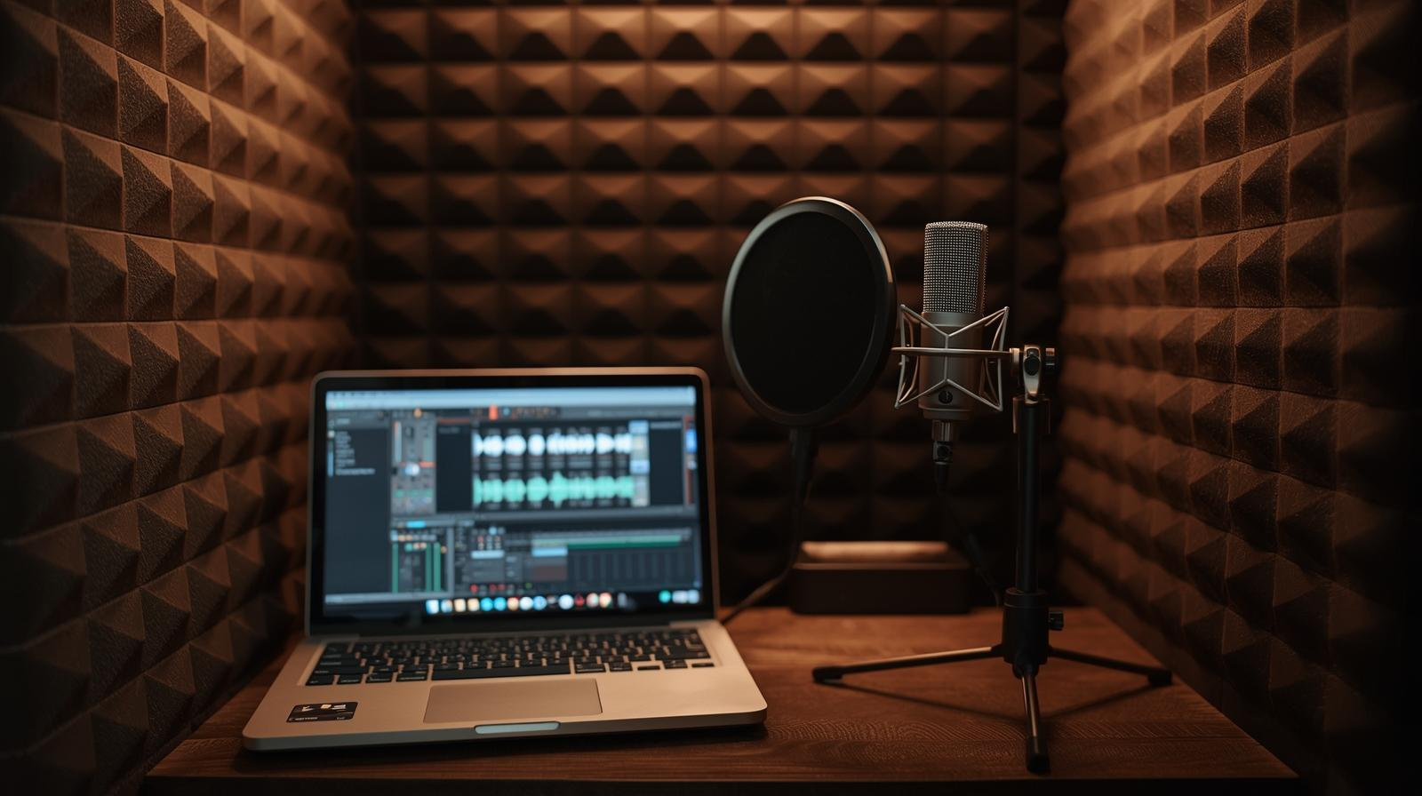graphic showing a voiceover booth with laptop and microphone-5 Time Management Tricks I Use to Juggle Business, Family, and Self-Care (Without Losing My Mind)